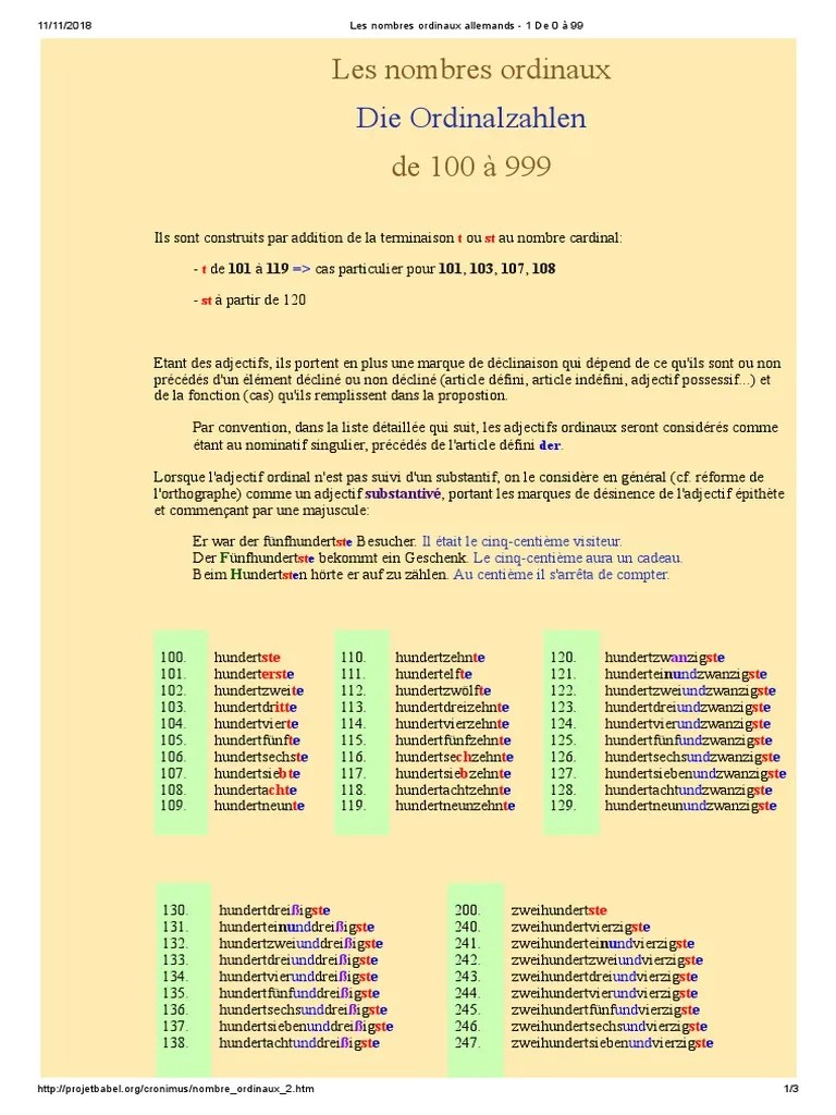 En mathématiques, on appelle nombre ordinal un objet permettant de caractériser le type d'ordre d'un ensemble bien ordonné quelconque, tout comme en . Leur orthographe est proche de celle des chiffres : Le premier, le deuxième, le troisième… Voici des nombres ordinaux en allemand. Les nombres ordinaux servent pour indiquer un ordre, par exemple, « le premier . Fiche de grammaire allemande : Free interactive exercises to practice online or download as pdf to print. Contrairement aux nombres cardinaux (one, two, three.), les nombres ordinaux permettent de classer quelque chose ou quelqu'un, de déterminer un rang: Comment utiliser les nombres ordinaux en allemand ? Il faut connaître les nombres cardinaux de 1 à 1000 avant de faire ces exercices. Écriture des nombres en chiffres et en lettres. En espagnol, il y a des nombres ordinaux très utilisés : Les nombres ordinaux servent à classer des éléments, à donner un rang :
